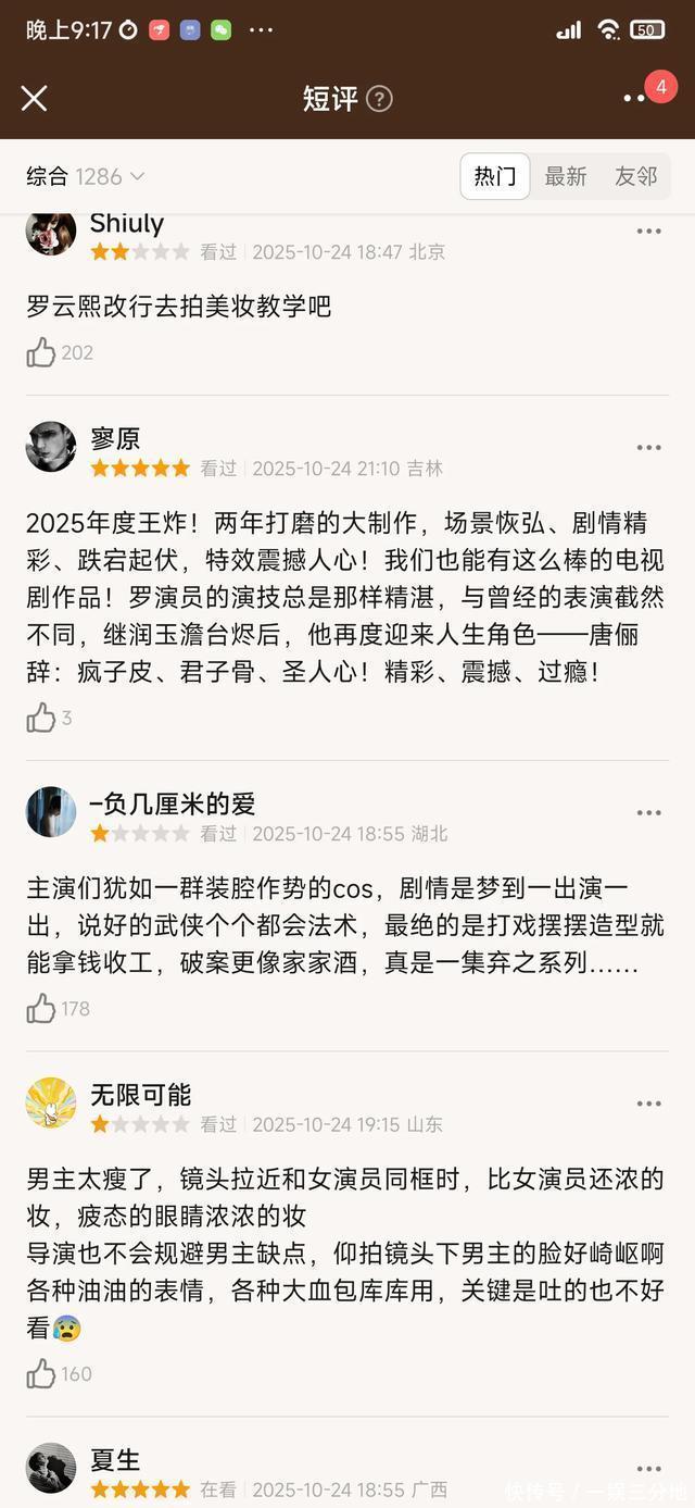 还有就是妆容太浓了,阴柔感很重。和女演员同框,感觉比女演员妆还浓,眼睛疲态。甚至有网友评价让罗云熙改行去拍美妆教学。