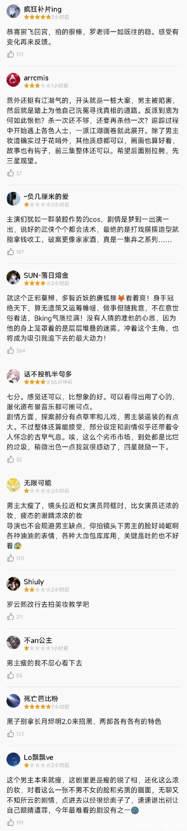 虽说男主妆造确实花哨,但整体质感不错,画面好看,故事有钩子,前几集总体还可以,瑕不掩瑜。而且总是说妆容也有些尬黑了,这妆造其实是适配正邪莫辨、多智近妖的唐狐狸的。罗云熙有那种破碎又悲悯的感觉,深受冠绝天下,算无遗策又运筹帷幄,其实很有吸引力的。